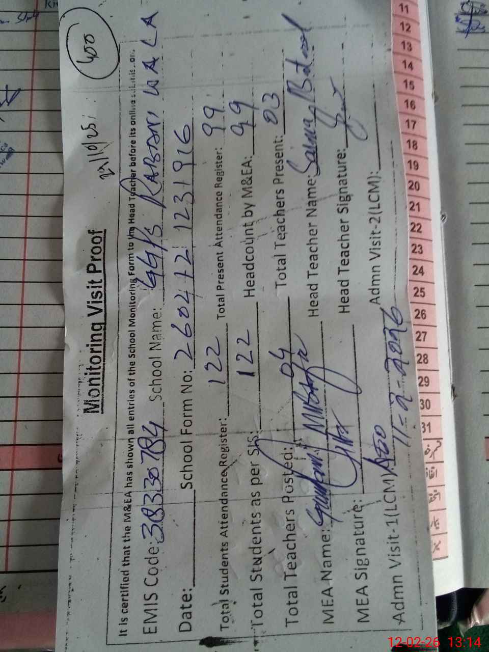 | Attendance Register | Head Teacher | MEA with School | Visit Proof |