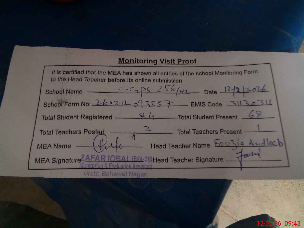 | Monitoring Date: 12-02-2026 | Start Time: 12-02-2026 09:27 AM | End Time: 12-02-2026 09:43 AM | Name of MEA: Za**** Iq**** BN**** | |