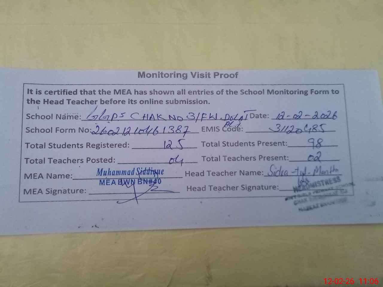 | EMIS Code: 31120485 | Name of School: GGPS CHAK 3 FW DOLAT ALI | |||