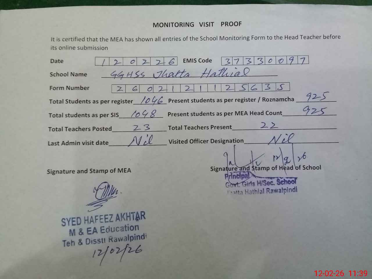 | Certified that this School was Inspected by the Undersigned MEA/DMO Today and the Information Stated Above is as Per Record. | |||||