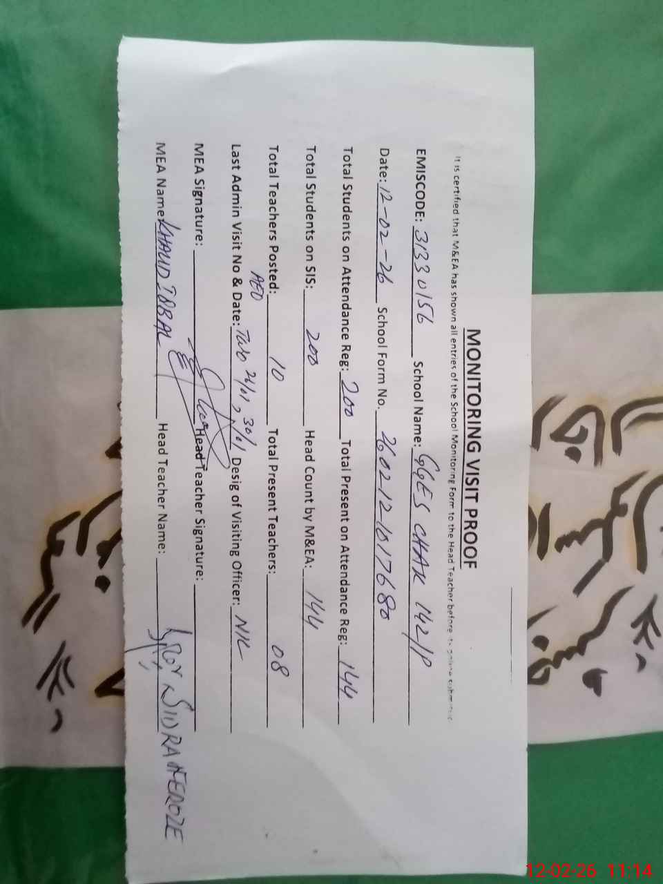 | Attendance Register | Head Teacher | MEA with School | Visit Proof |