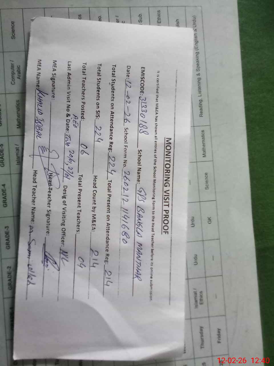 | EMIS Code: 31330188 | Name of School: GPS BANGLA MANTHAR | |||