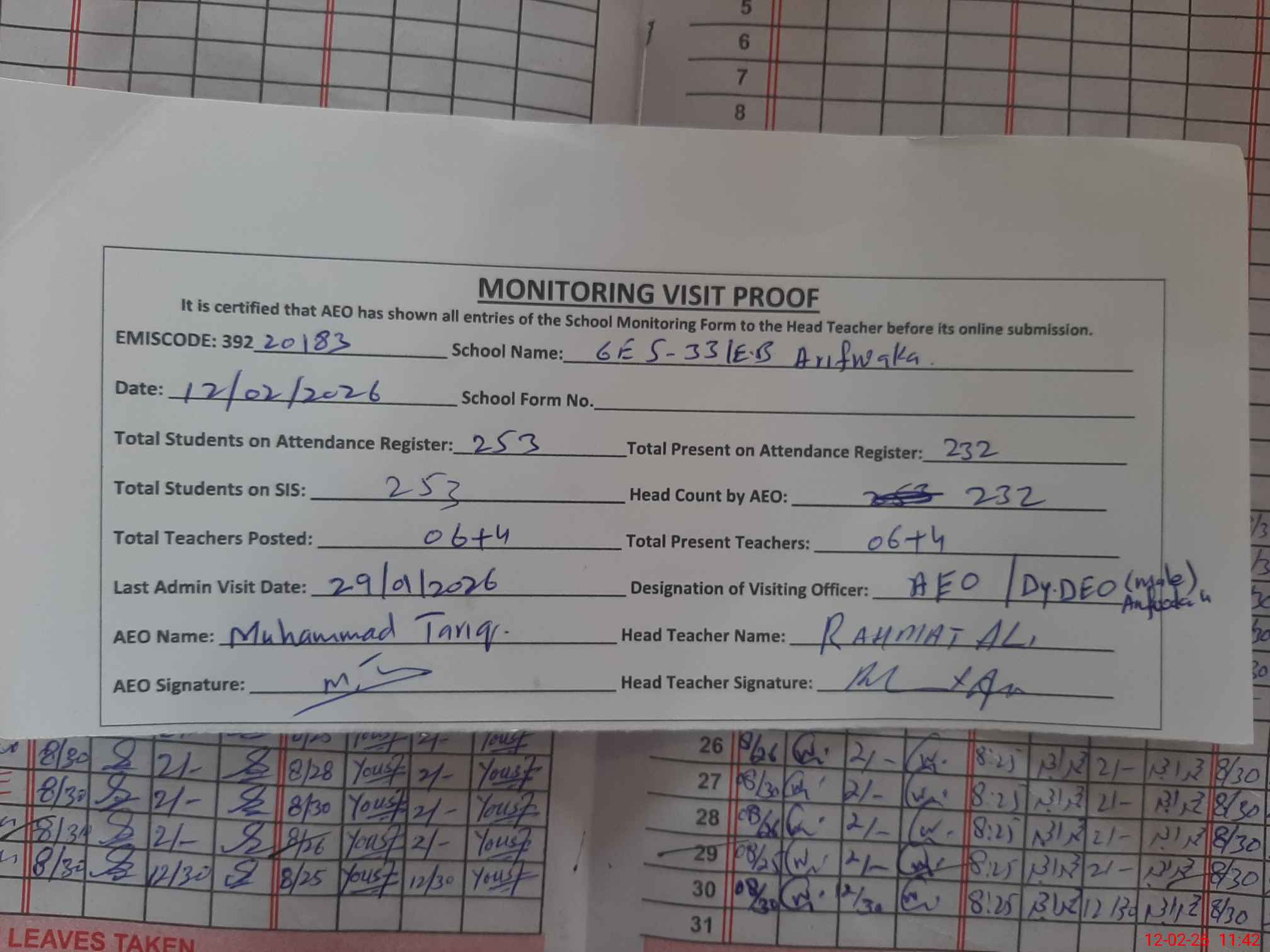 | Attendance Register | Head Teacher | MEA with School | Visit Proof |