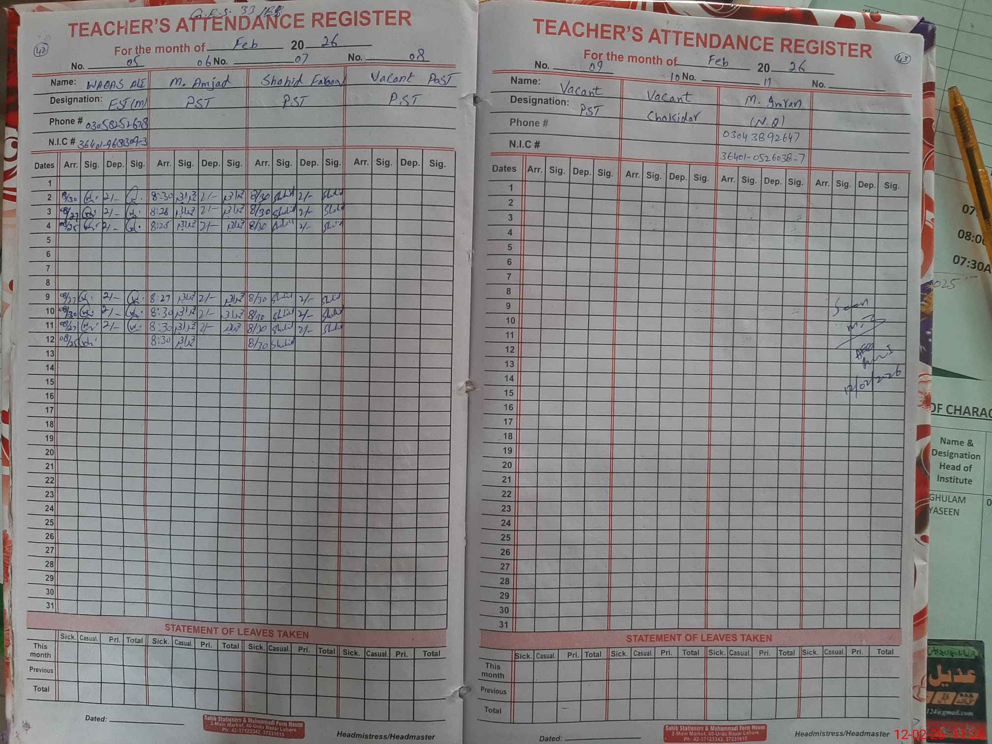 | CNIC | Full Name | Designation | R/C | Absence During Last Calender Month |
