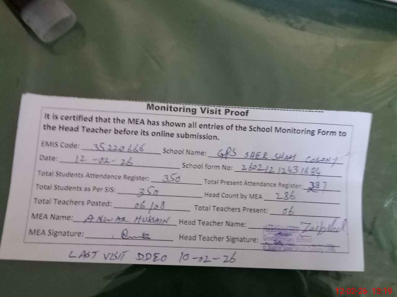 | Attendance Register | Head Teacher | MEA with School | Visit Proof |