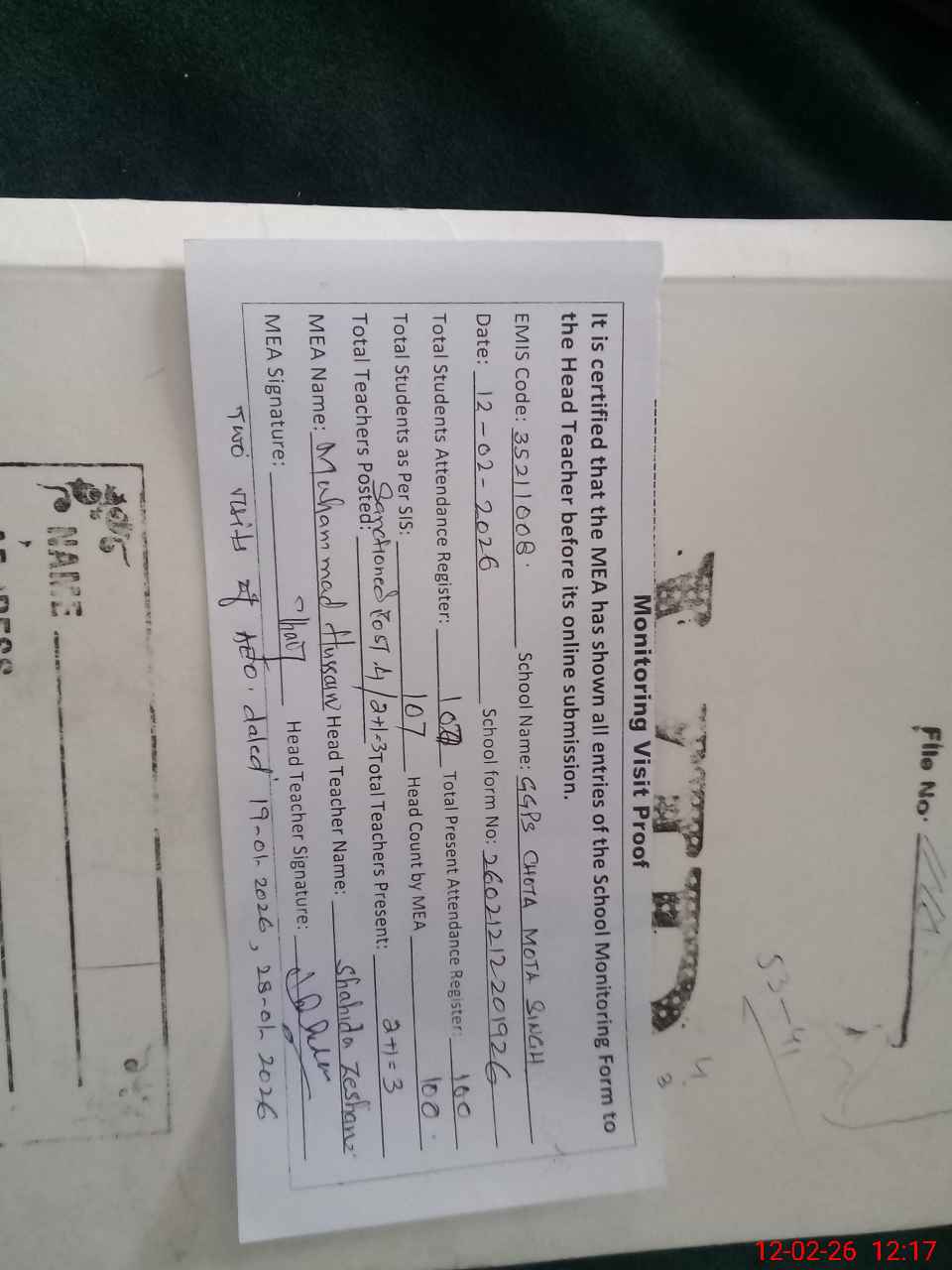 | Attendance Register | Head Teacher | MEA with School | Visit Proof |
