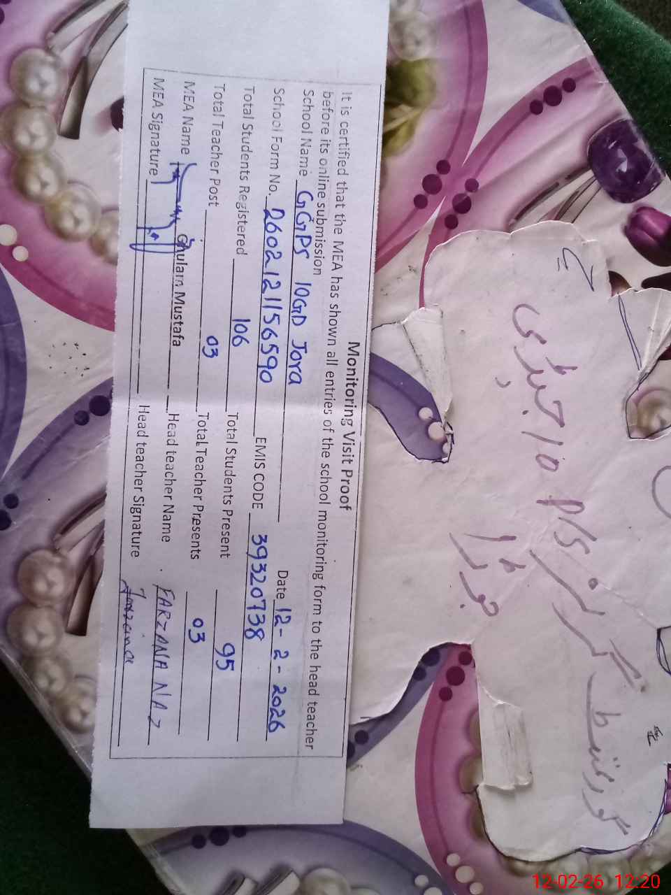 | Certified that this School was Inspected by the Undersigned MEA/DMO Today and the Information Stated Above is as Per Record. | |||||
