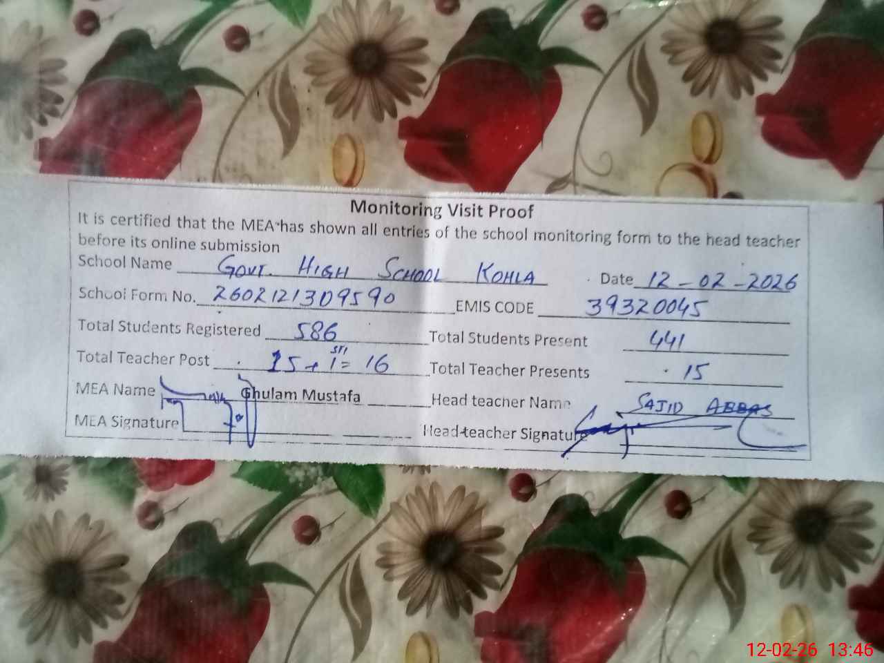 | Certified that this School was Inspected by the Undersigned MEA/DMO Today and the Information Stated Above is as Per Record. | |||||