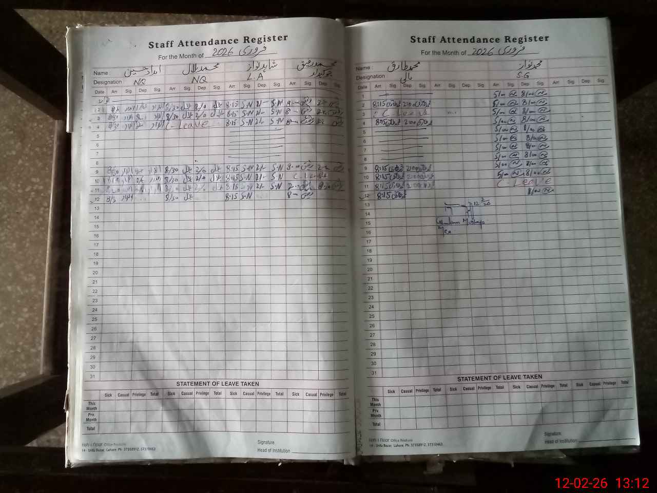 | CNIC | Full Name | Designation | R/C | Absence During Last Calender Month |