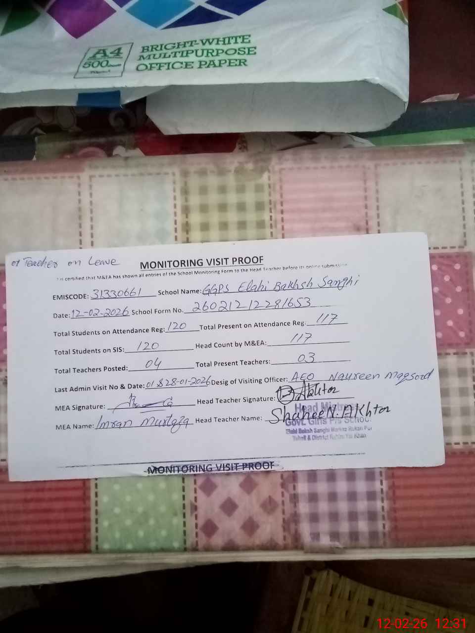 | Attendance Register | Head Teacher | MEA with School | Visit Proof |