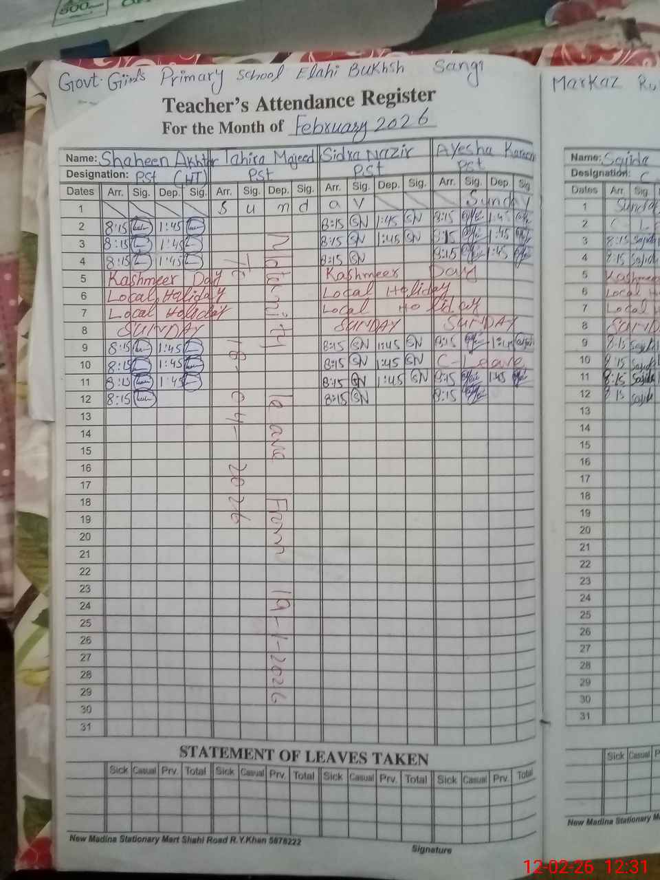 | Leave | Duty | Absent | Maternity | Medical | Ex- Pak |