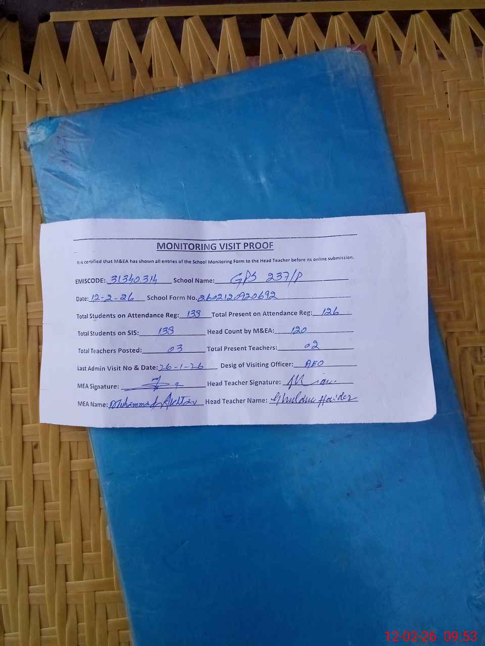 | Attendance Register | Head Teacher | MEA with School | Visit Proof |