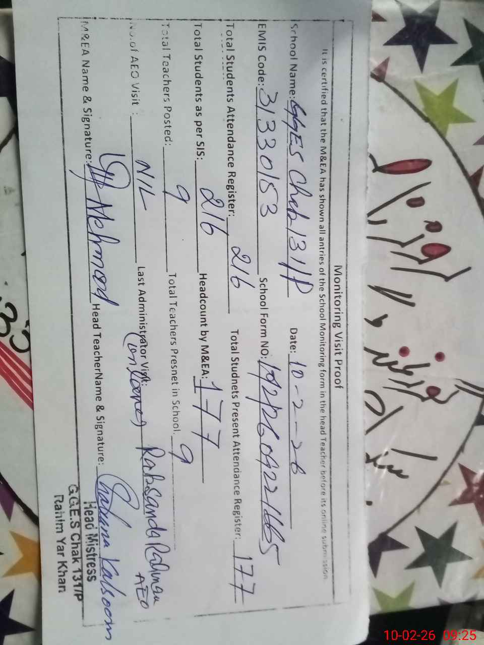 | Attendance Register | Head Teacher | MEA with School | Visit Proof |