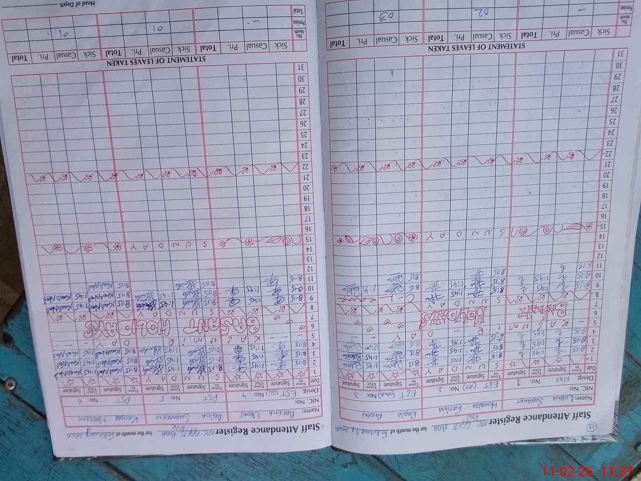 | CNIC | Full Name | Designation | R/C | Absence During Last Calender Month |