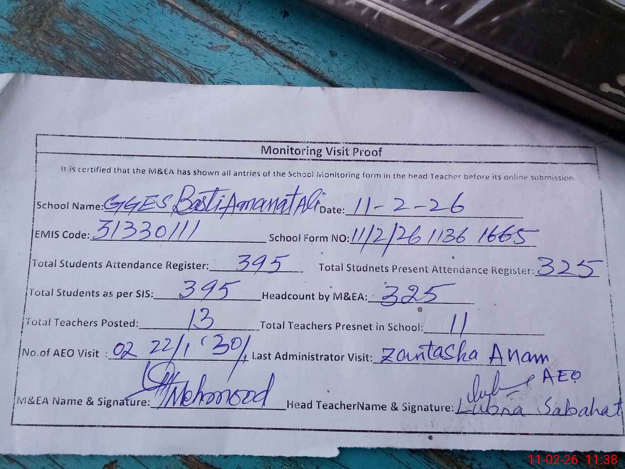 | Monitoring Date: 11-02-2026 | Start Time: 11-02-2026 11:06 AM | End Time: 11-02-2026 11:38 AM | Name of MEA: Ma**** UlHa**** | |