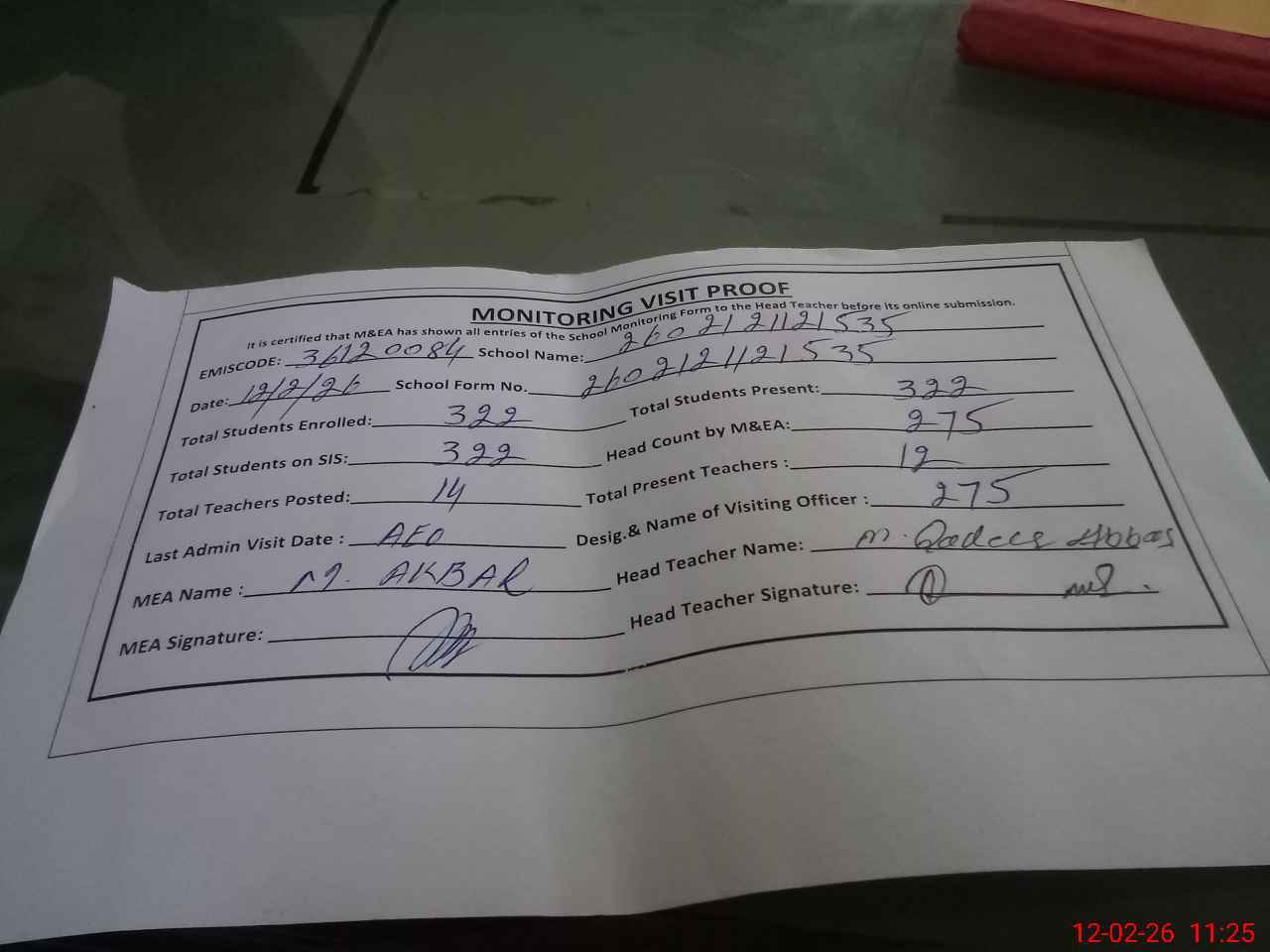 | Attendance Register | Head Teacher | MEA with School | Visit Proof |