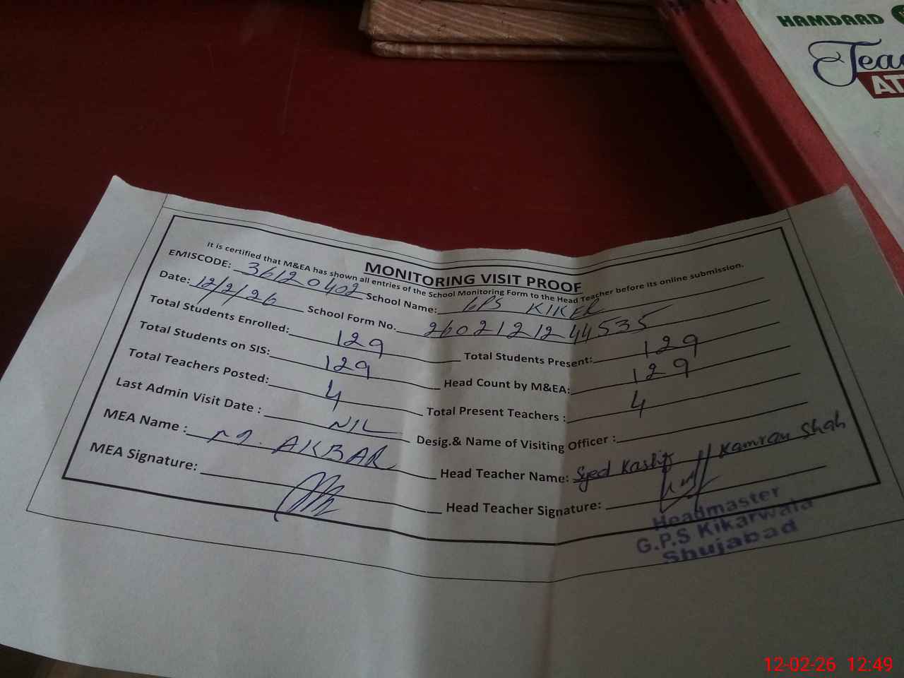 | Attendance Register | Head Teacher | MEA with School | Visit Proof |