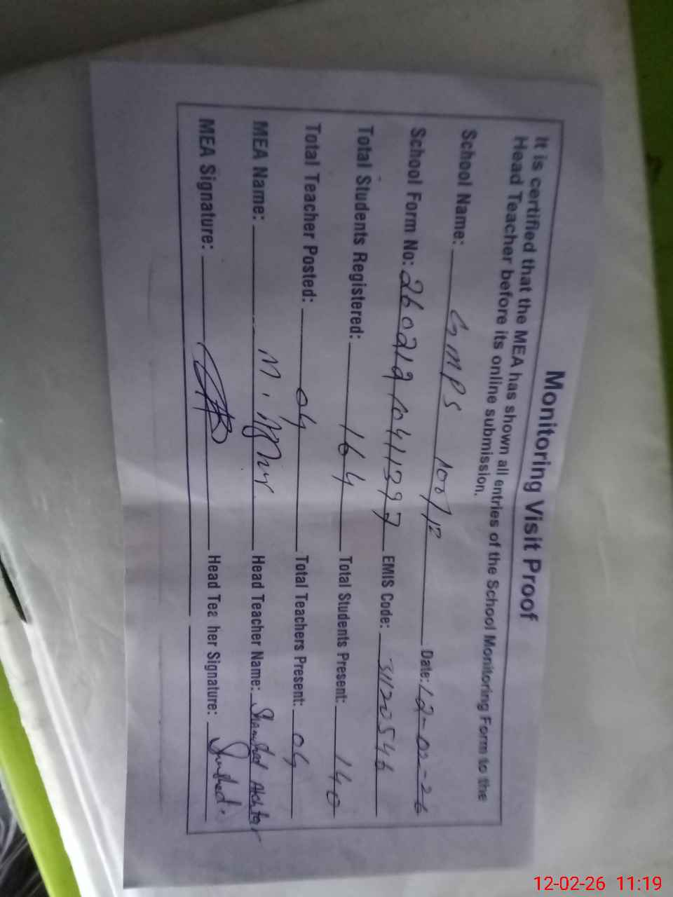 | Attendance Register | Head Teacher | MEA with School | Visit Proof |