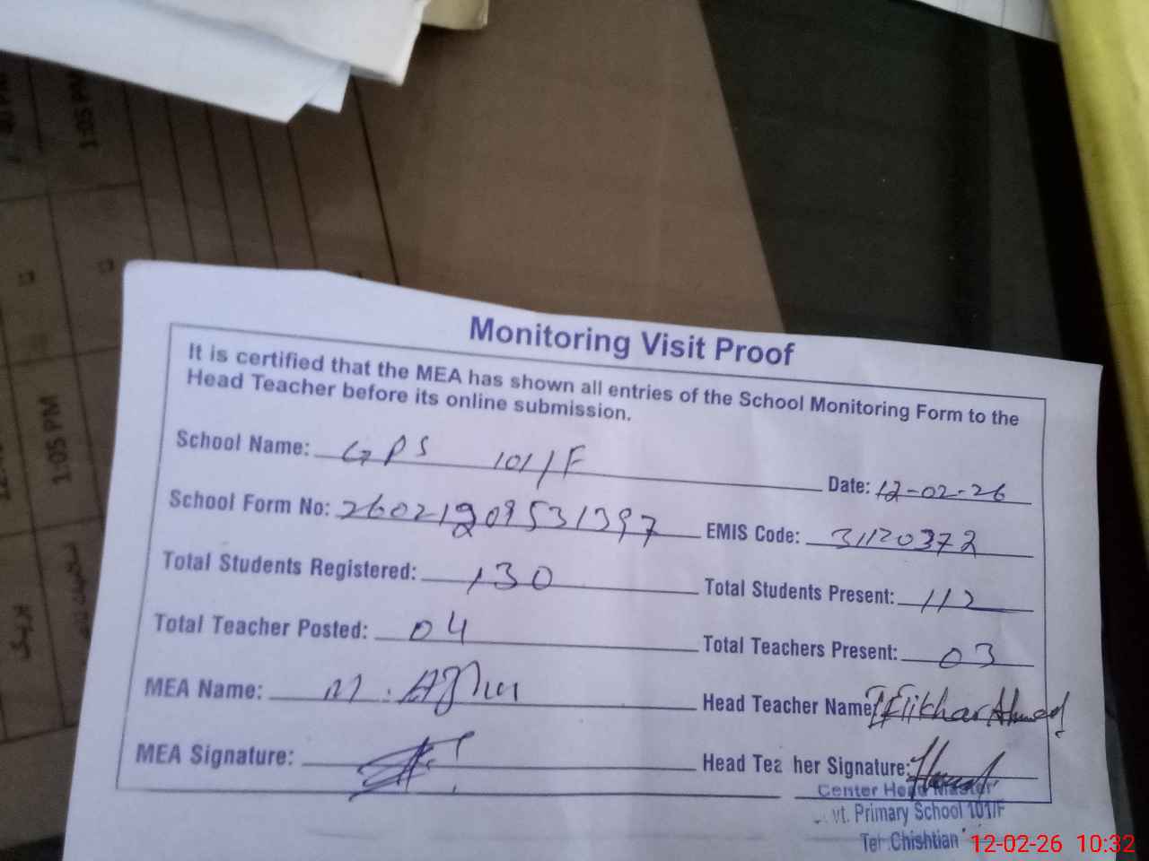 | EMIS Code: 31120372 | Name of School: GPS CHAK NO 101 F | |||