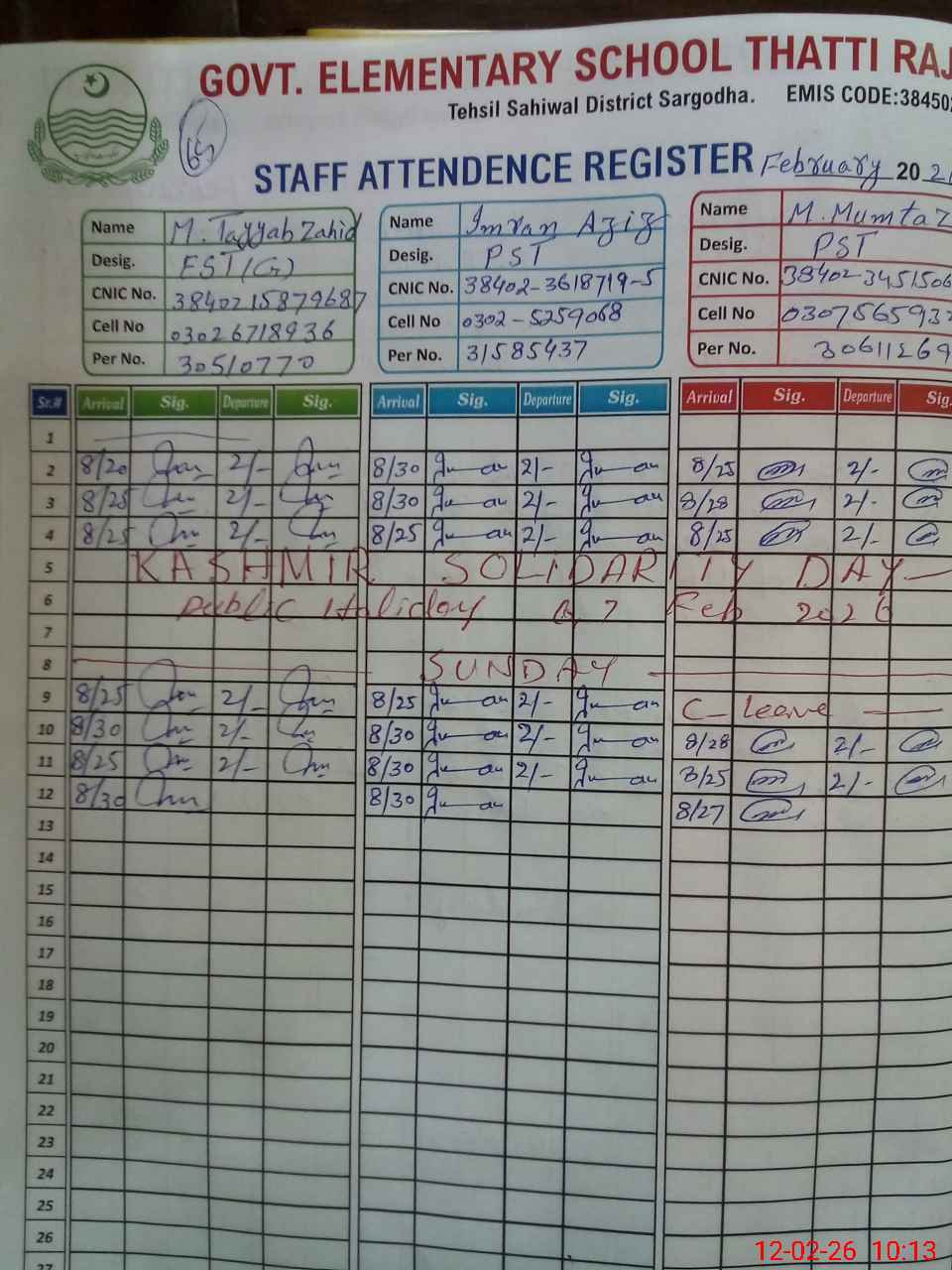 | CNIC | Full Name | Designation | R/C | Absence During Last Calender Month |
