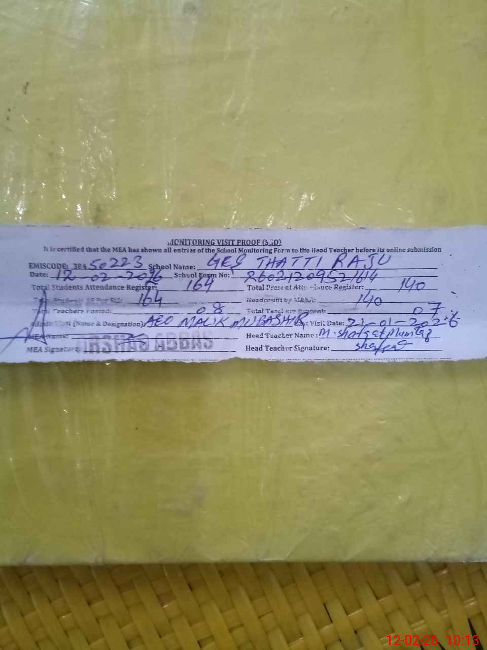| Attendance Register | Head Teacher | MEA with School | Visit Proof |