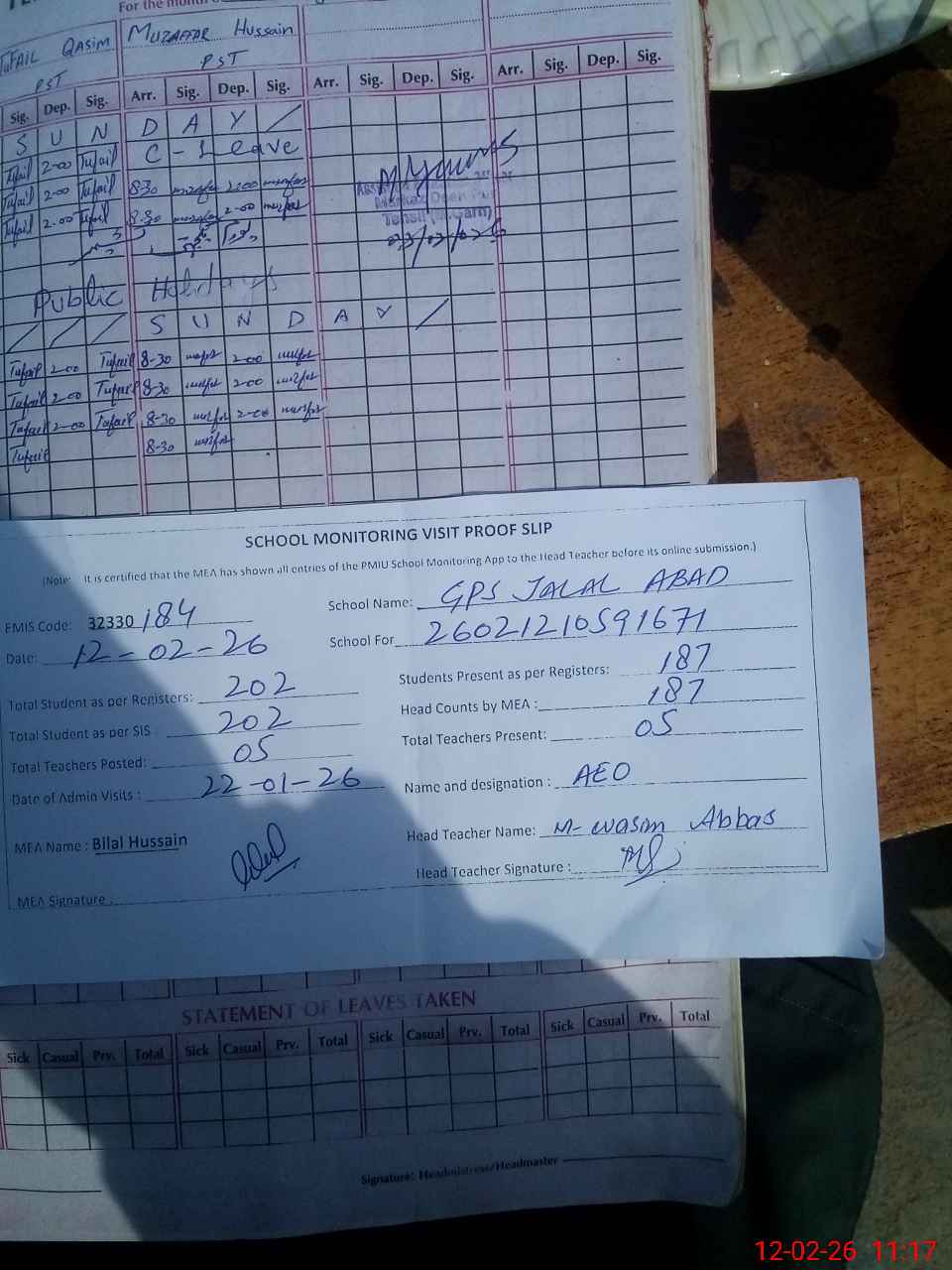| Attendance Register | Head Teacher | MEA with School | Visit Proof |