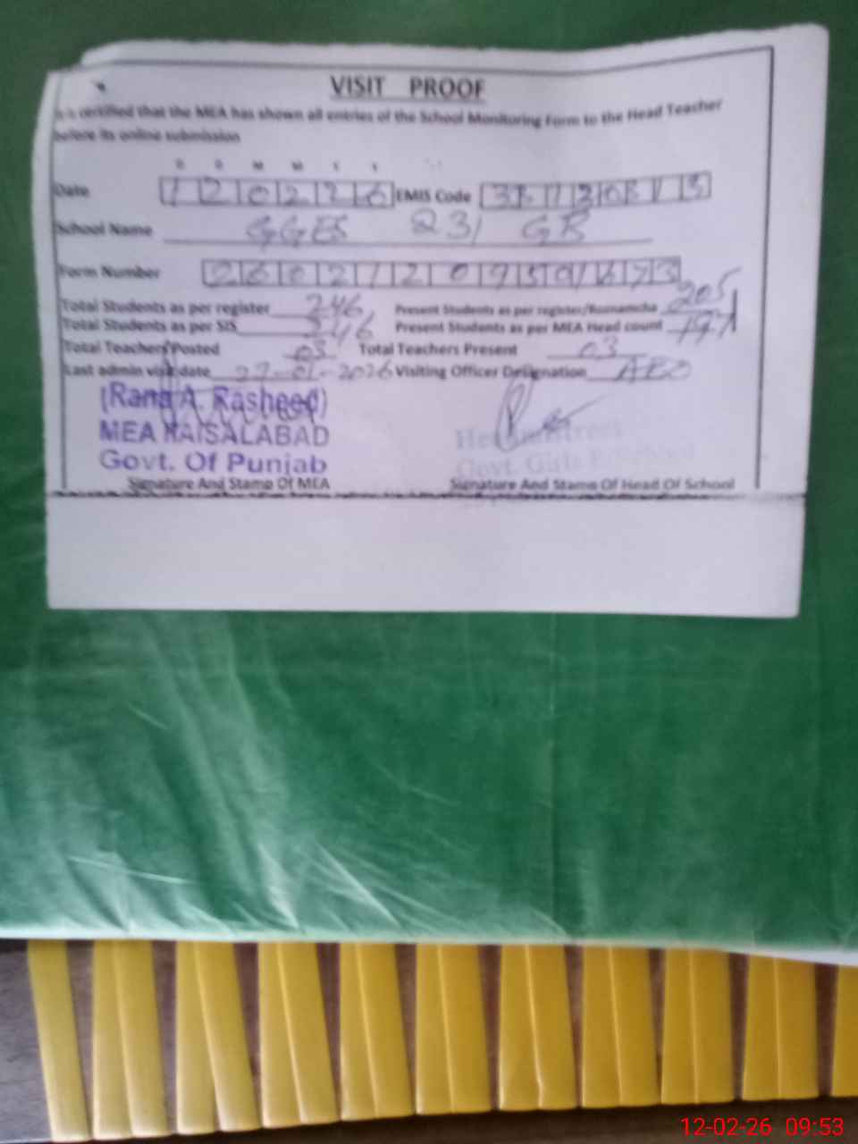 | Attendance Register | Head Teacher | MEA with School | Visit Proof |