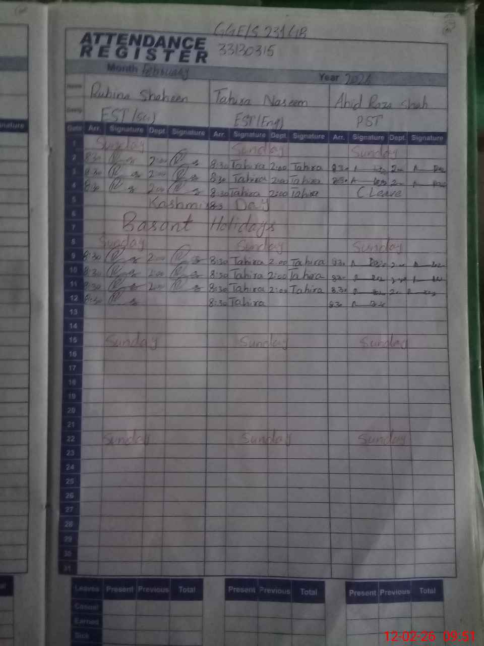| CNIC | Full Name | Designation | R/C | Absence During Last Calender Month |