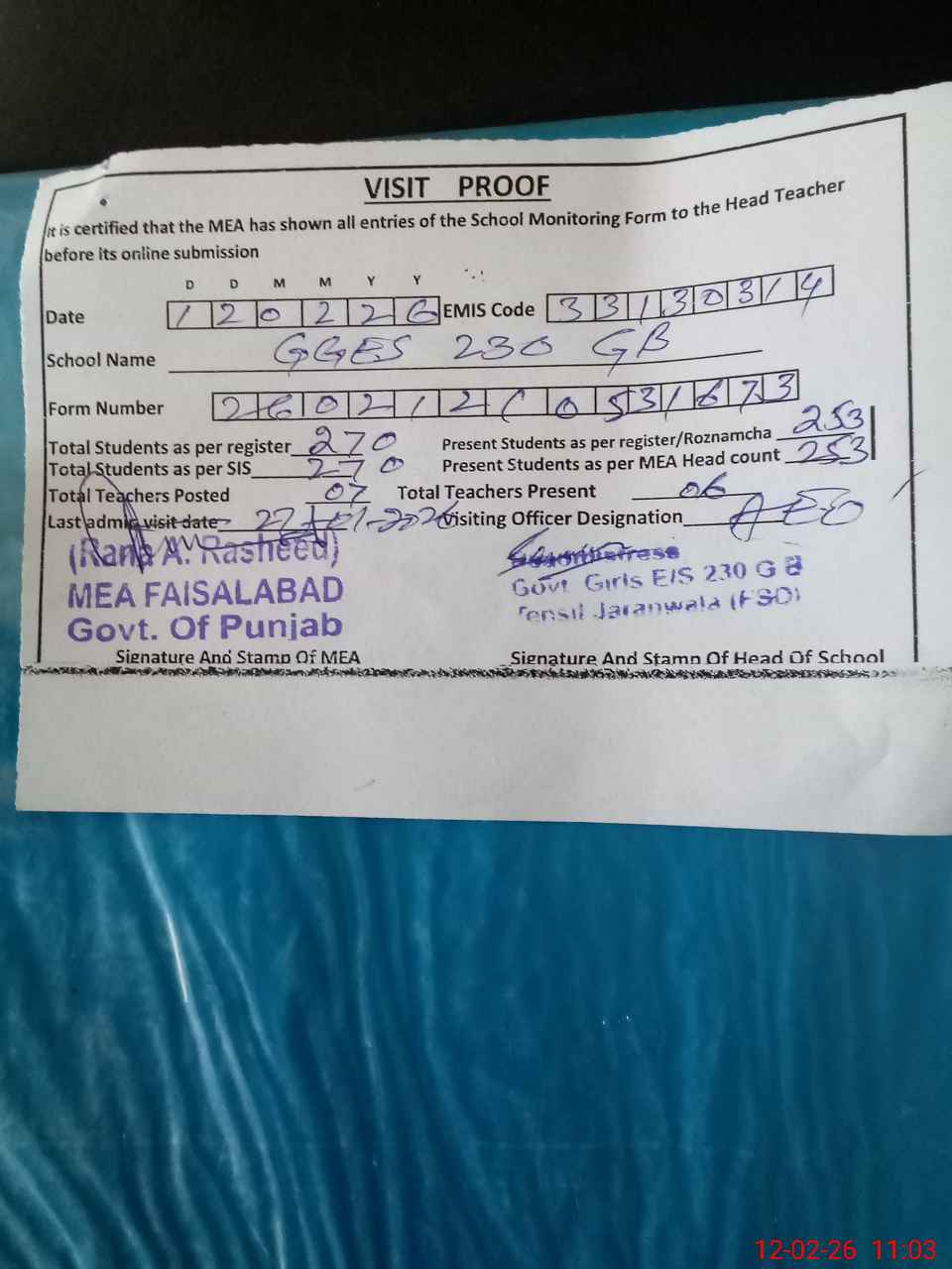 | Attendance Register | Head Teacher | MEA with School | Visit Proof |
