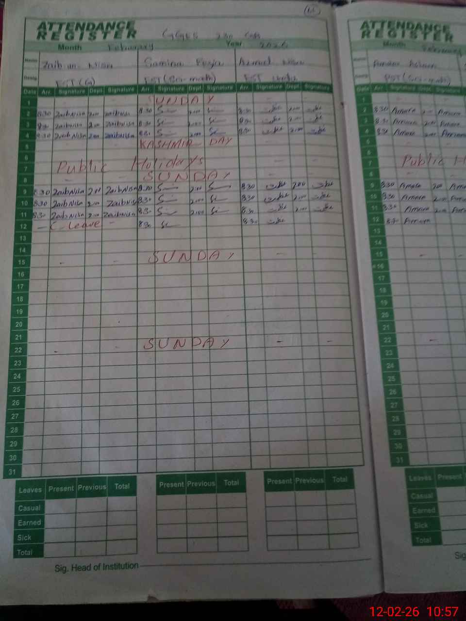 | CNIC | Full Name | Designation | R/C | Absence During Last Calender Month |