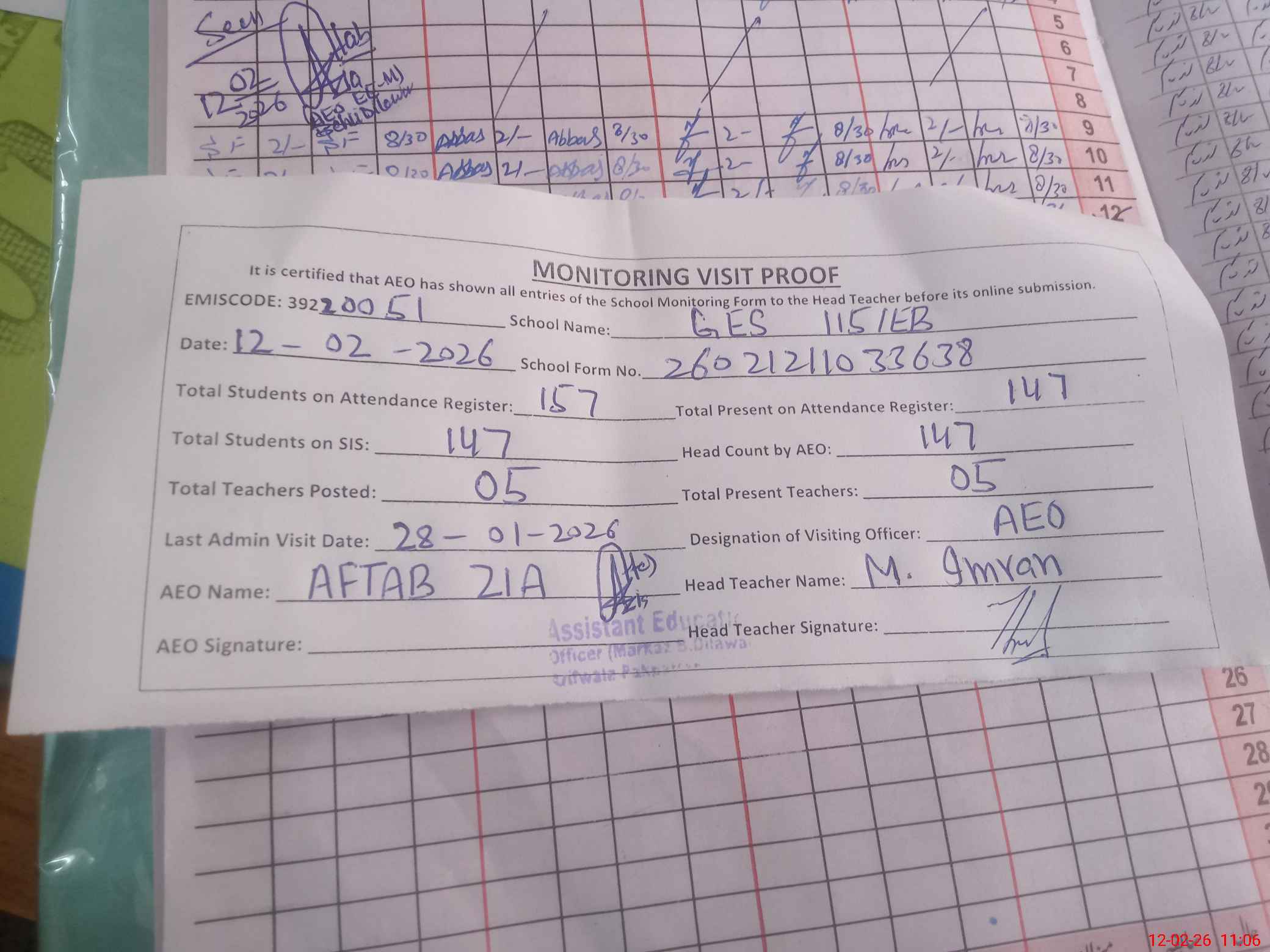 | Attendance Register | Head Teacher | MEA with School | Visit Proof |