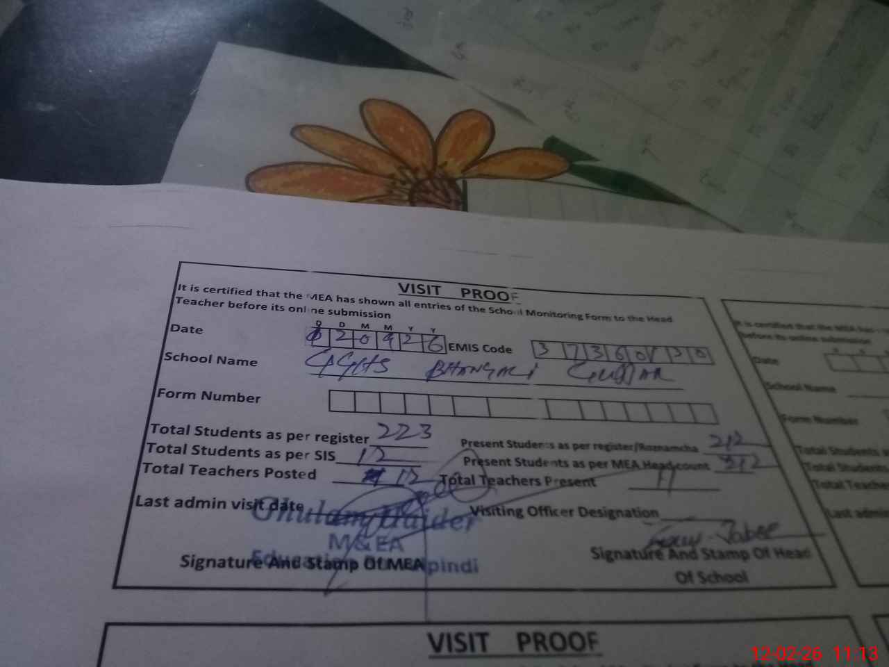 | Attendance Register | Head Teacher | MEA with School | Visit Proof |