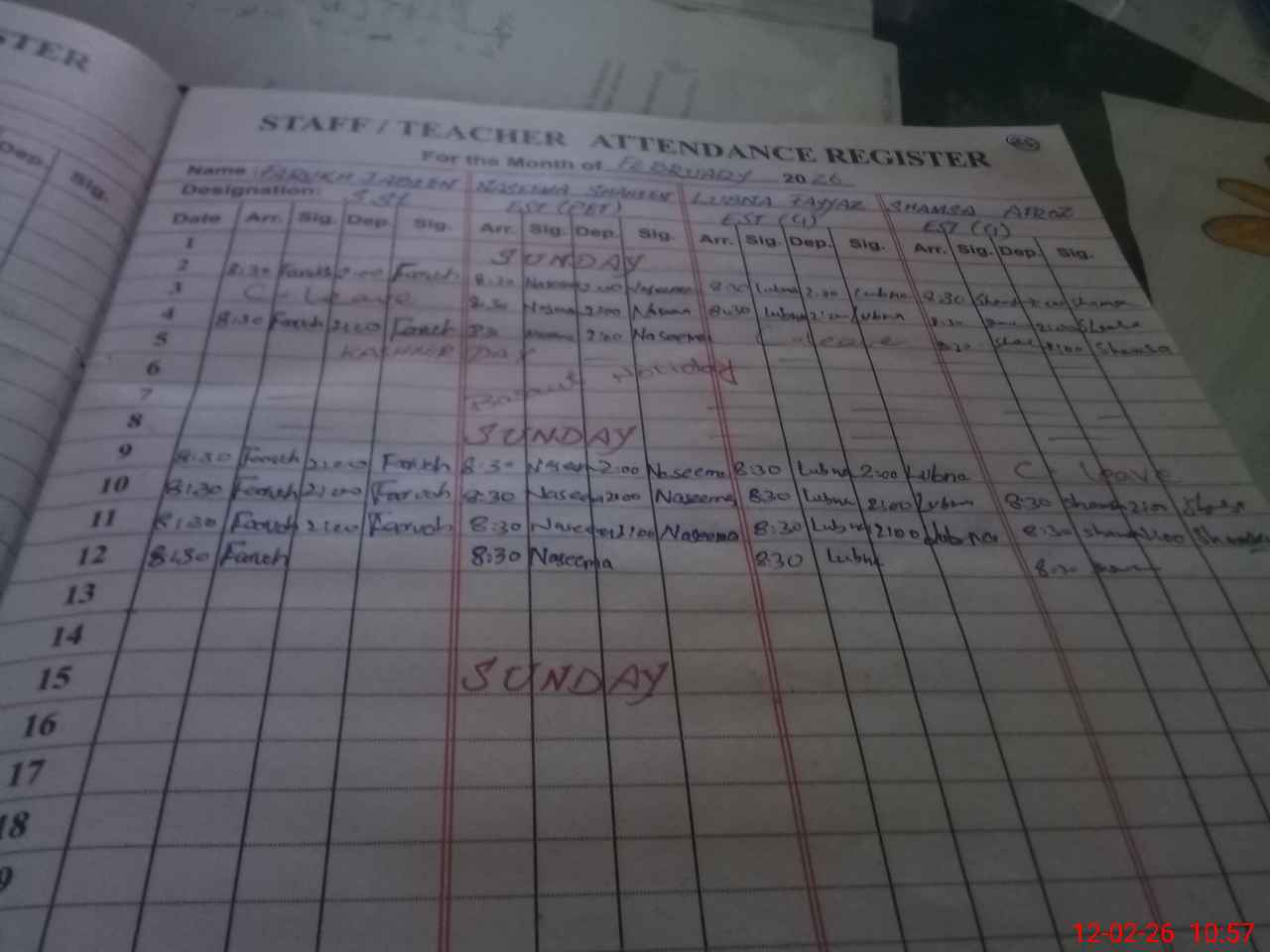 | CNIC | Full Name | Designation | R/C | Absence During Last Calender Month |
