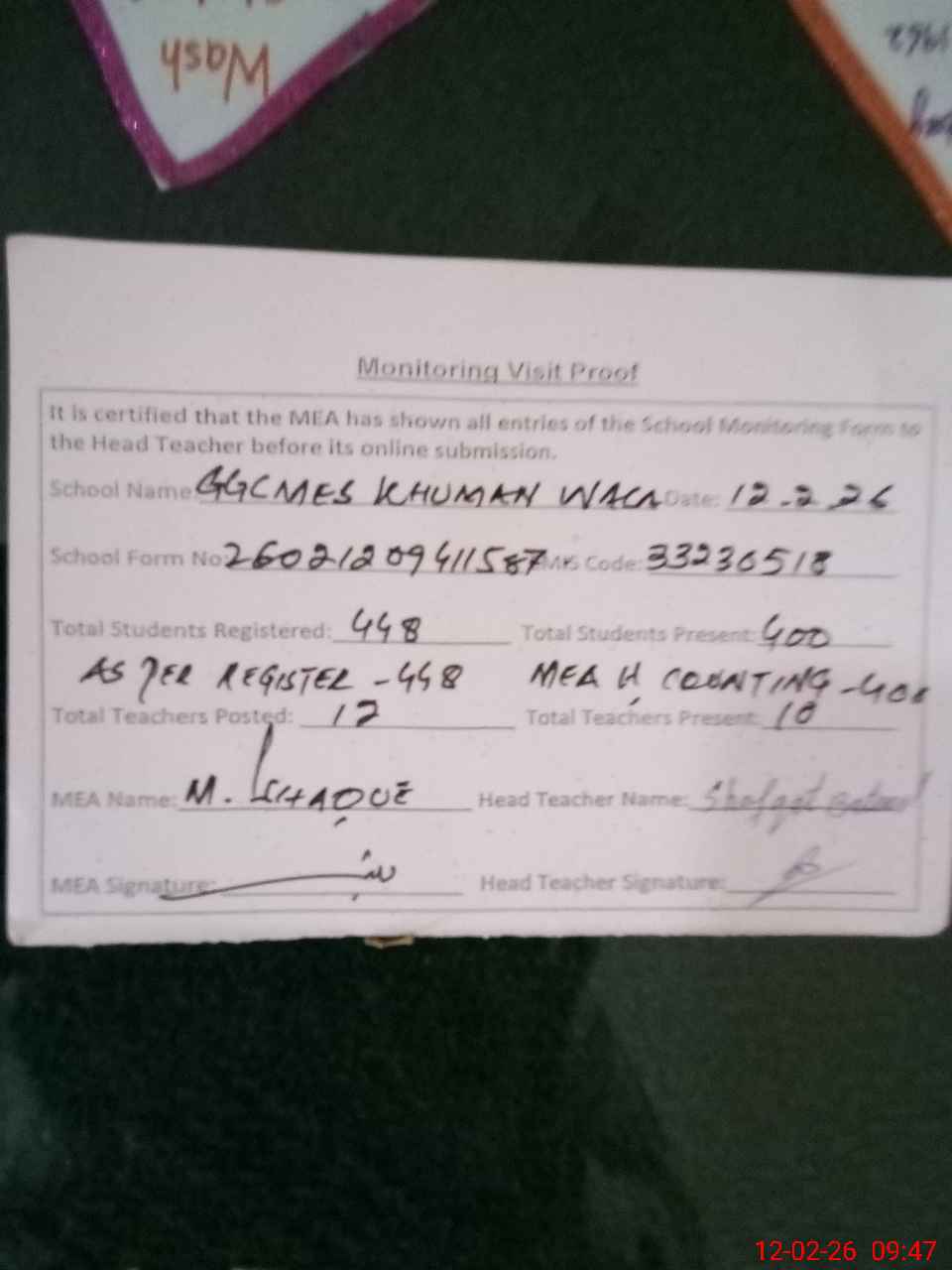 | Attendance Register | Head Teacher | MEA with School | Visit Proof |