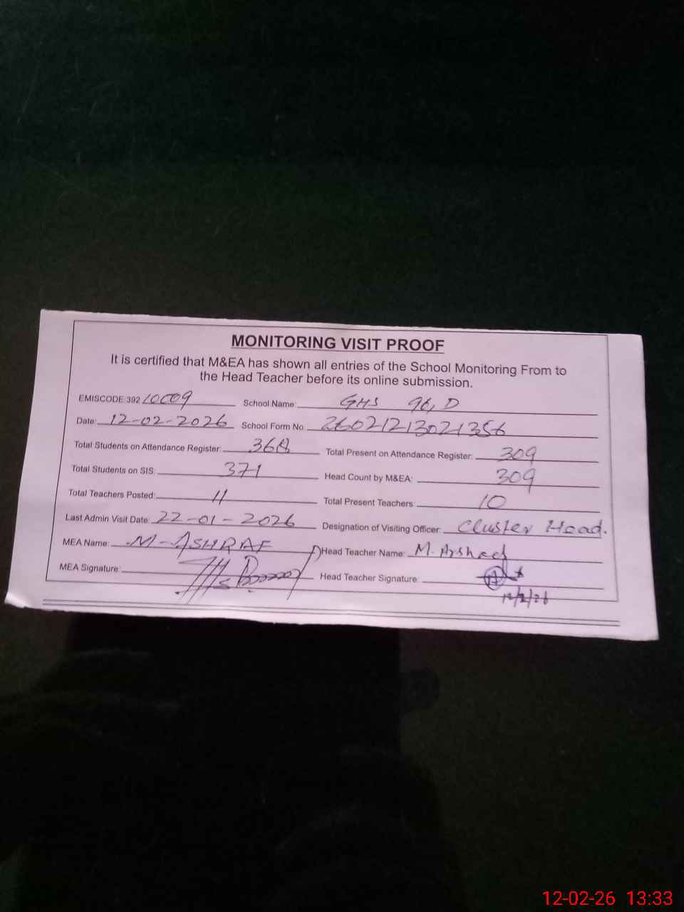 | EMIS Code: 39210009 | Name of School: GHS CHAK NO. 96/D | |||