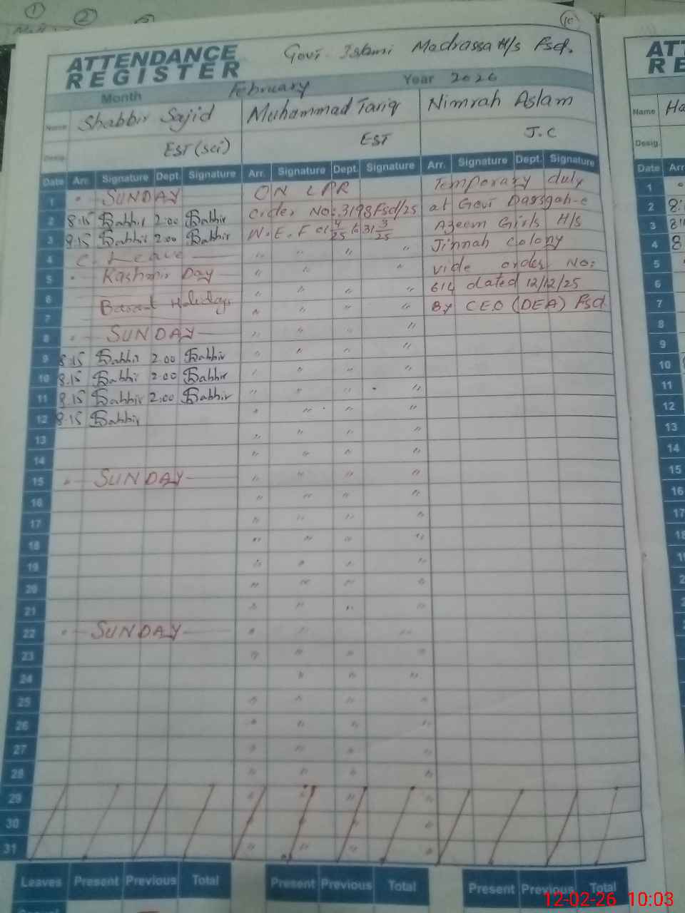| CNIC | Full Name | Designation | R/C | Absence During Last Calender Month |