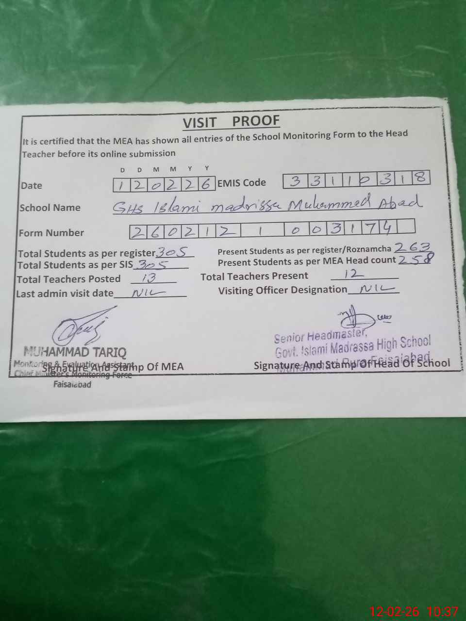 | Attendance Register | Head Teacher | MEA with School | Visit Proof |
