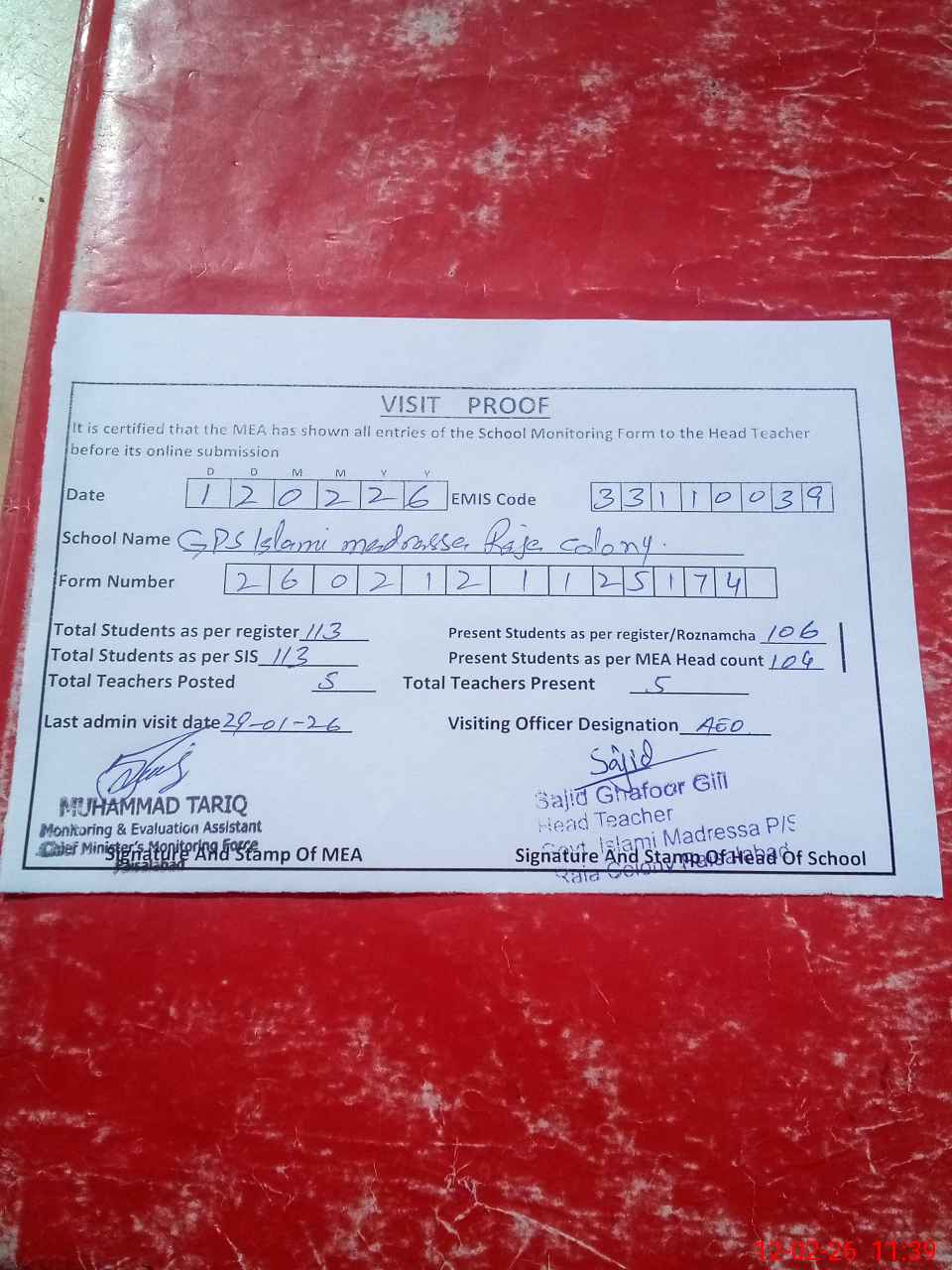 | Attendance Register | Head Teacher | MEA with School | Visit Proof |