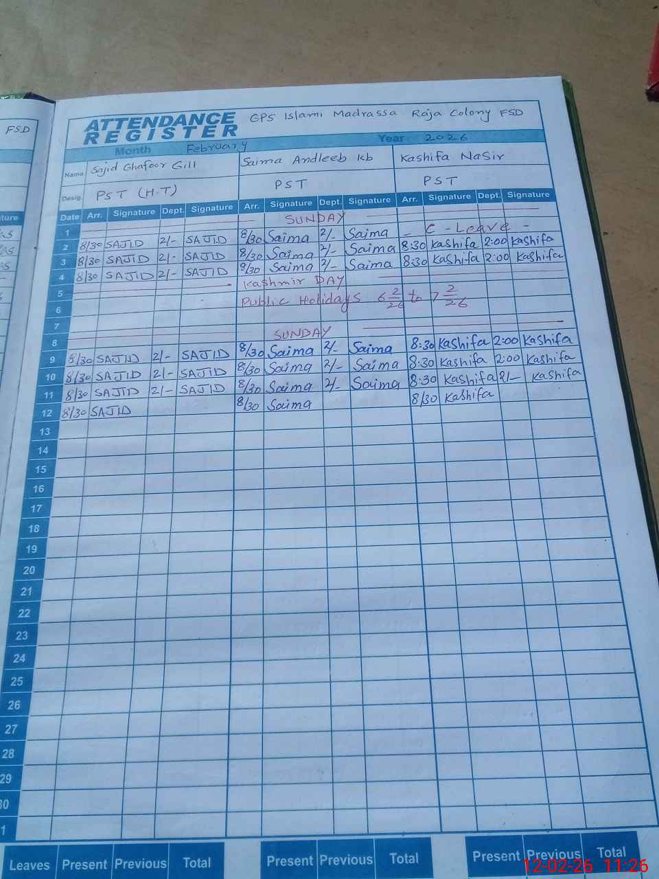 | CNIC | Full Name | Designation | R/C | Absence During Last Calender Month |