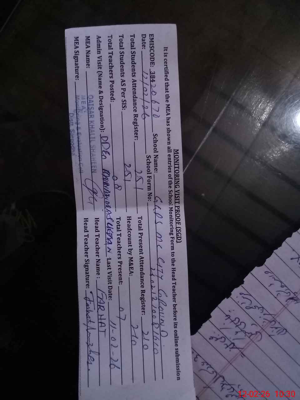 | Attendance Register | Head Teacher | MEA with School | Visit Proof |
