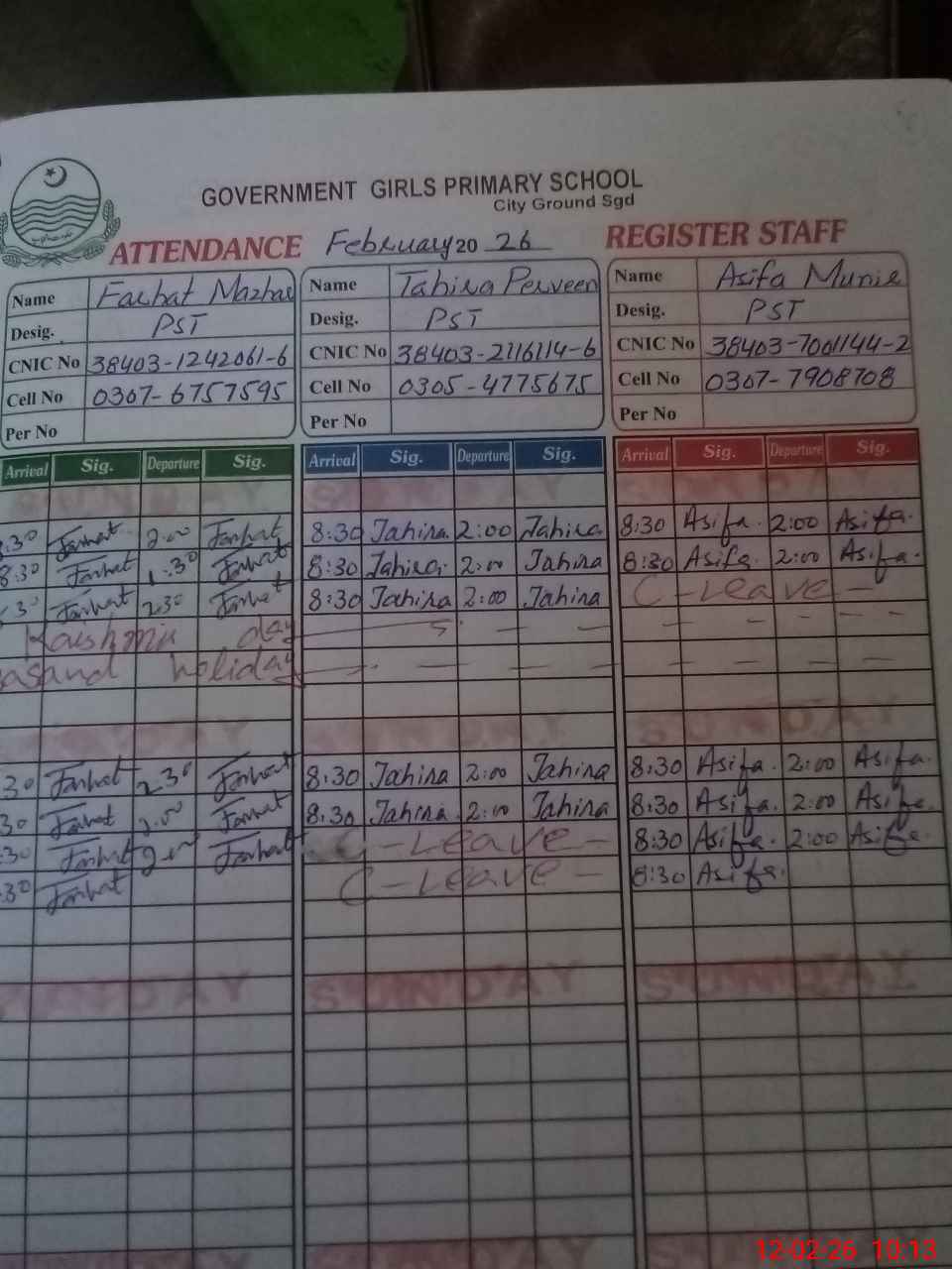 | CNIC | Full Name | Designation | R/C | Absence During Last Calender Month |