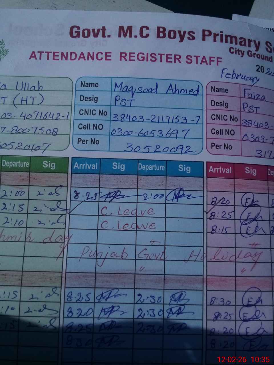 | CNIC | Full Name | Designation | R/C | Absence During Last Calender Month |