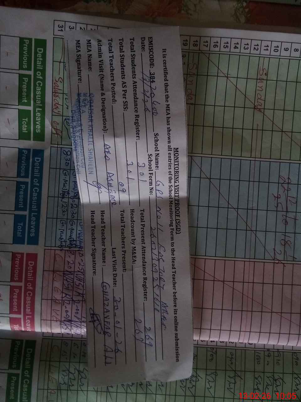 | Attendance Register | Head Teacher | MEA with School | Visit Proof |