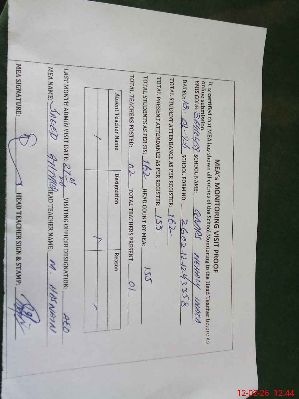 | Certified that this School was Inspected by the Undersigned MEA/DMO Today and the Information Stated Above is as Per Record. | |||||