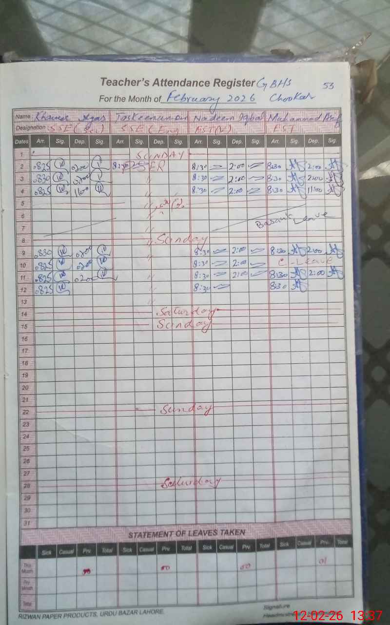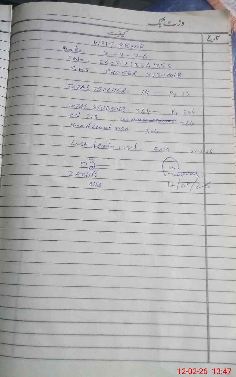 | EMIS Code: 37340018 | Name of School: GHS CHOOKAR | |||