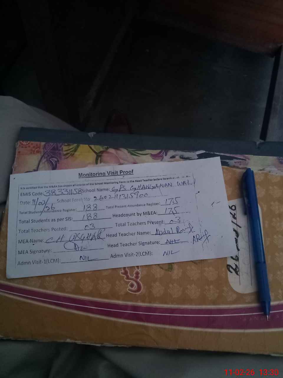 | Attendance Register | Head Teacher | MEA with School | Visit Proof |
