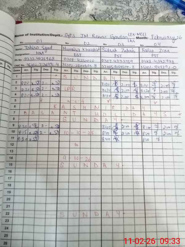 | CNIC | Full Name | Designation | R/C | Absence During Last Calender Month |