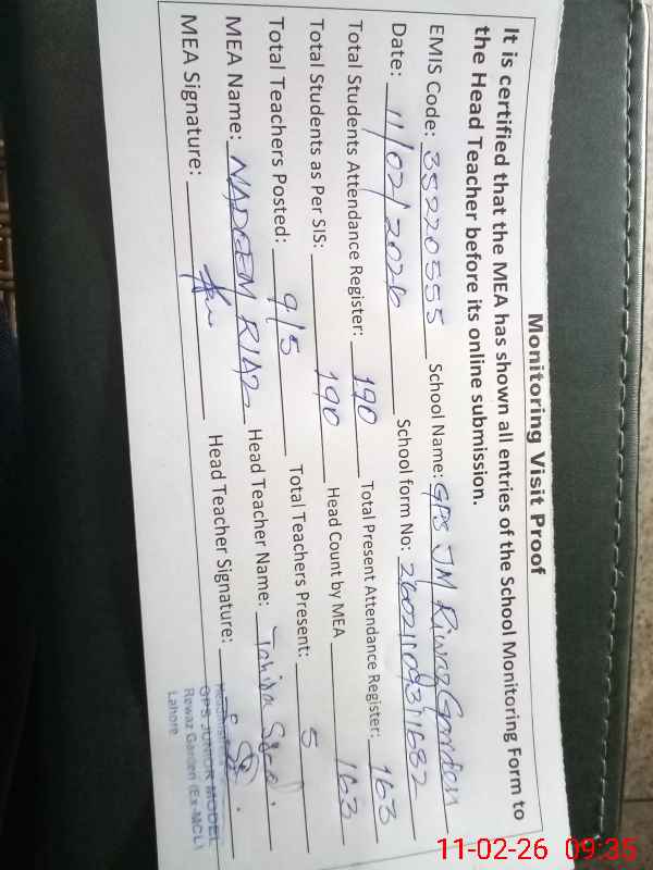 | EMIS Code: 35220555 | Name of School: GPS JUNIOR MODEL RIWAZ GARDEN | |||