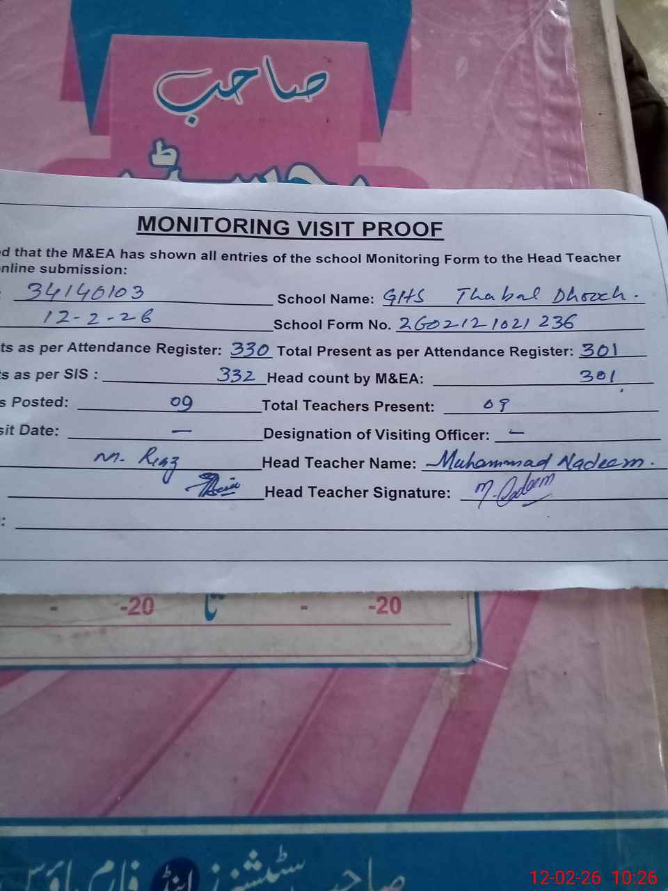 | Attendance Register | Head Teacher | MEA with School | Visit Proof |