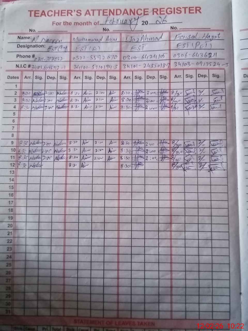 | CNIC | Full Name | Designation | R/C | Absence During Last Calender Month |